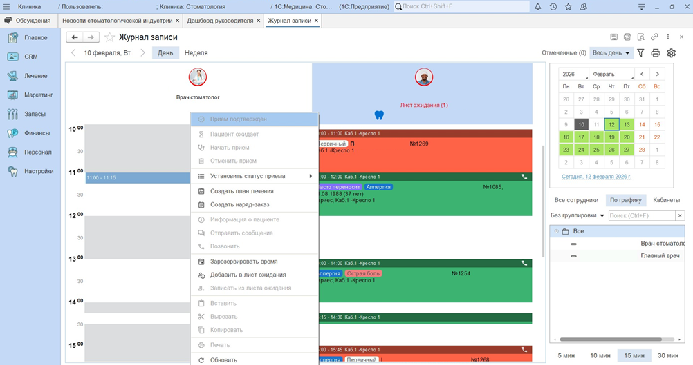приложения врач-стоматолог имеет доступ к журналу записей, графику работы, истории приемов