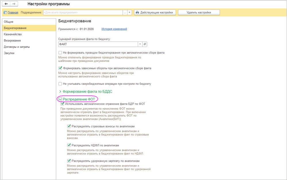 Настройка «Распределять НДФЛ по аналитикам» позволяет распределять удержанный НДФЛ по ЦФО/проектам и автоматически отражать эти суммы в бюджетировании. Это дает возможность видеть полную нагрузку на ФОТ по управленческим аналитикам, включая налоги.