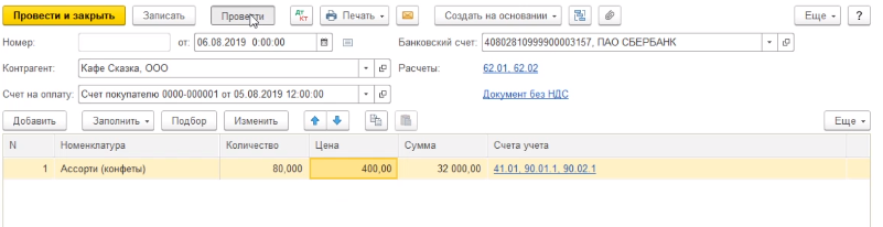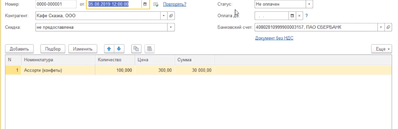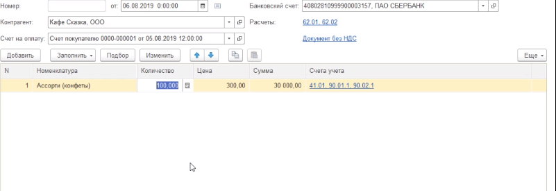 В нашем случае мы выставляли счет на сто единиц конфет ассорти. Необходимо отредактировать эту цифру до фактической отгрузки - восемьдесят штук. Мы это делаем вручную, прямо непосредственно в документе.