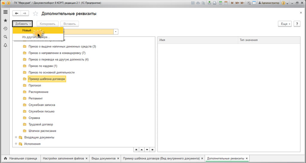 Если создать новый реквизит, то вам потребуется указать наименование и задать тип значения. Для этого пишем "Дополнительное значение", и задаем список на закладке "Значение".