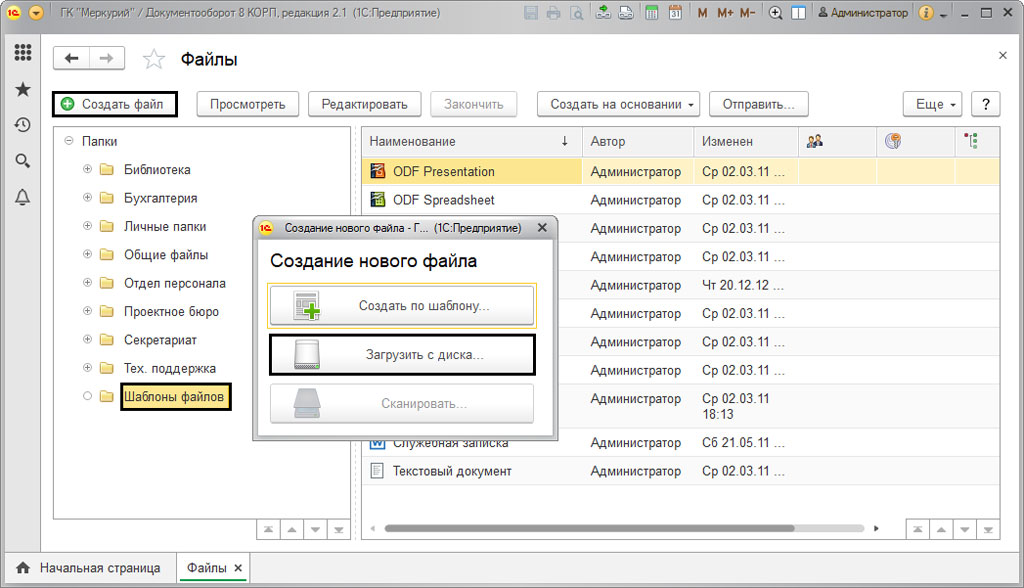 В появившемся окне, нажимаем на "Шаблоны файлов", скачиваем нашу новою заготовку, по нажатию кнопки "Создать файл". В следующем окне выбираем команду "Загрузить с диска".
