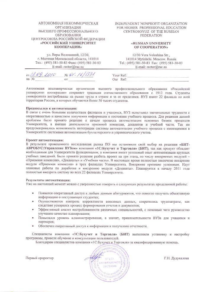 Дудукалова Елена Николаевна, 1-й проректор Российского университета кооперации, рассказывает об итогах автоматизации: "Мы довольны результатами внедрения "БИТ.Приемная комиссия", так как операции, которые раньше требовали многочасовых усилий, теперь выполняются автоматически простым нажатием на кнопку, при этом исключено появление ошибок. Мы благодарны специалистам 1С:Первый БИТ за качественную работу".