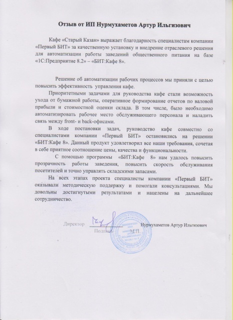 «В ходе постановки задач по автоматизации нашего кафе, мы, совместно со специалистами компании «1С:Первый БИТ» остановились на решении БИТ:Кафе 8. Данный продукт удовлетворил все наши требования, сочетая в себе приятное соотношение цены, качества и функциональности», - говорит директор кафе Нурмухаметов Артур Ильгизович.